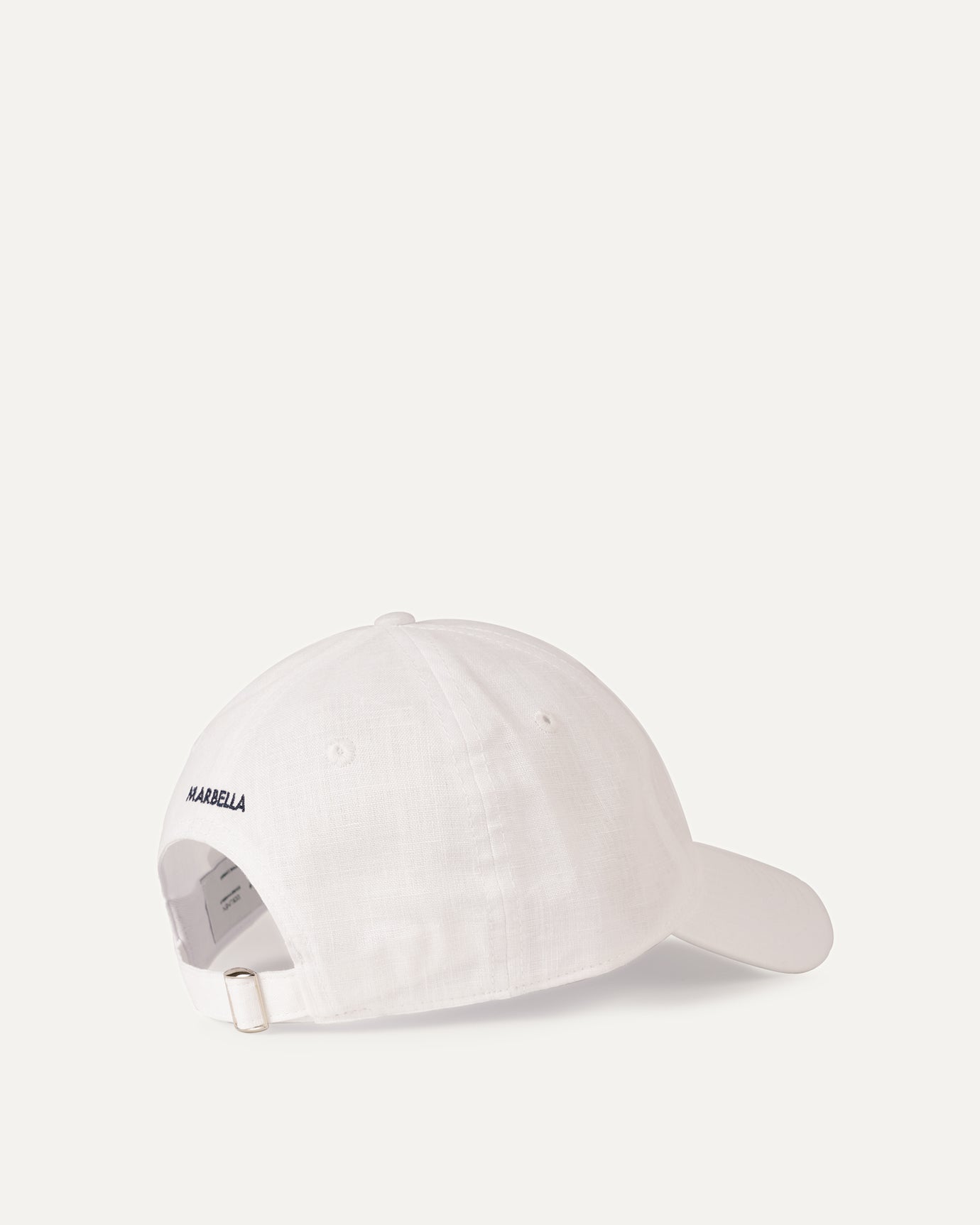 "MARBELLA" embroidery and adjustable slider buckle at the back.